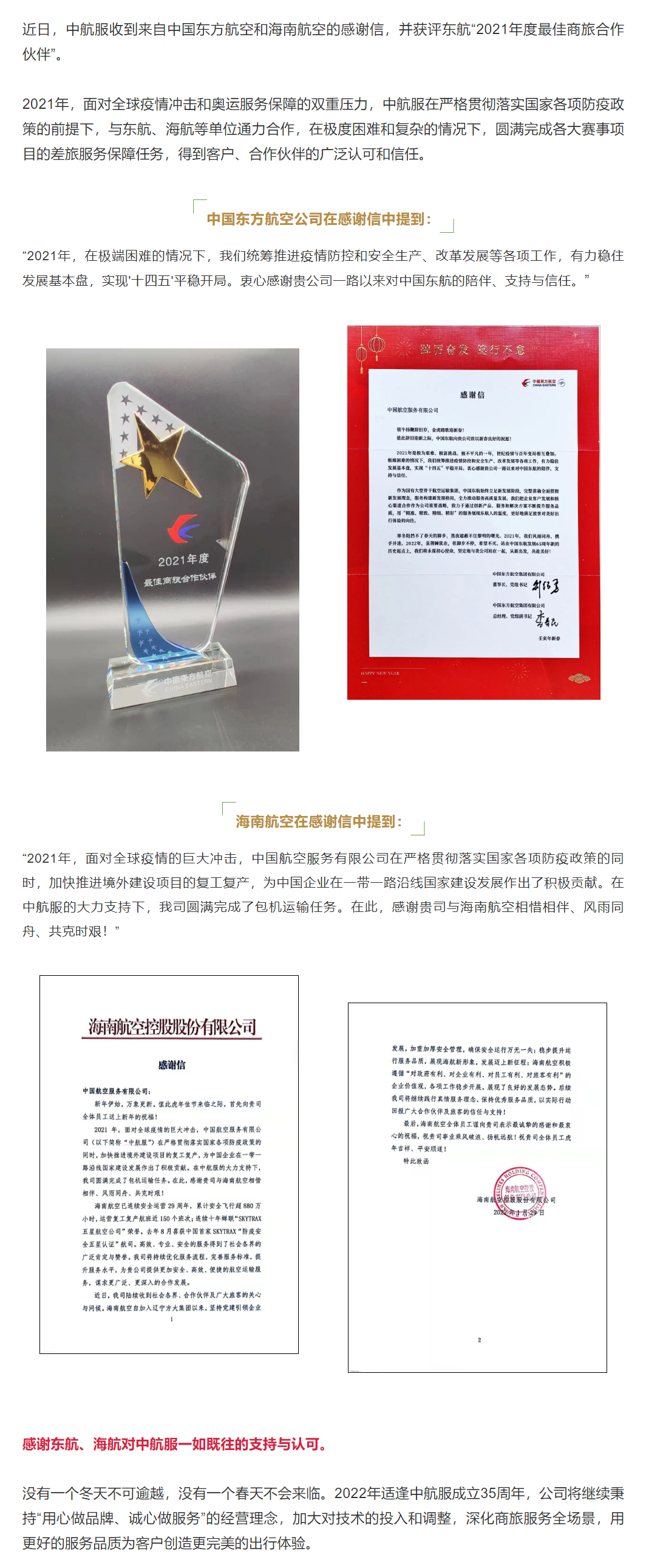 中航服喜获东航、海航感谢信,并获评东航年度最佳商旅合作伙伴